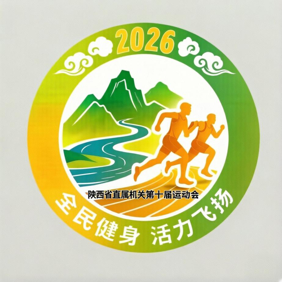 本届运动会的会徽,以圆融之形纳三秦风貌,融运动激情与生态之美于一体,彰显新时代陕西机关干部的昂扬风貌。会徽中心的巍峨山峦,取意秦岭龙脉;层叠苍翠间流淌的碧水,既似渭河蜿蜒,又如汉江清波,勾勒出“山水陕西”的生态画卷,传递绿色发展理念;上方祥云纹样,源自秦汉瓦当,古韵悠长,承载着三秦大地深厚的历史底蕴;奔跑的运动员,身姿矫健,象征着拼搏进取的体育精神;金黄的色调,既呼应黄土高原的厚重,也寓意收获与希望。他们踏在象征跑道的金色线条上,与绿水青山相映,寓意在生态文明的基石上,全民健身蔚然成风,活力与激情飞扬。