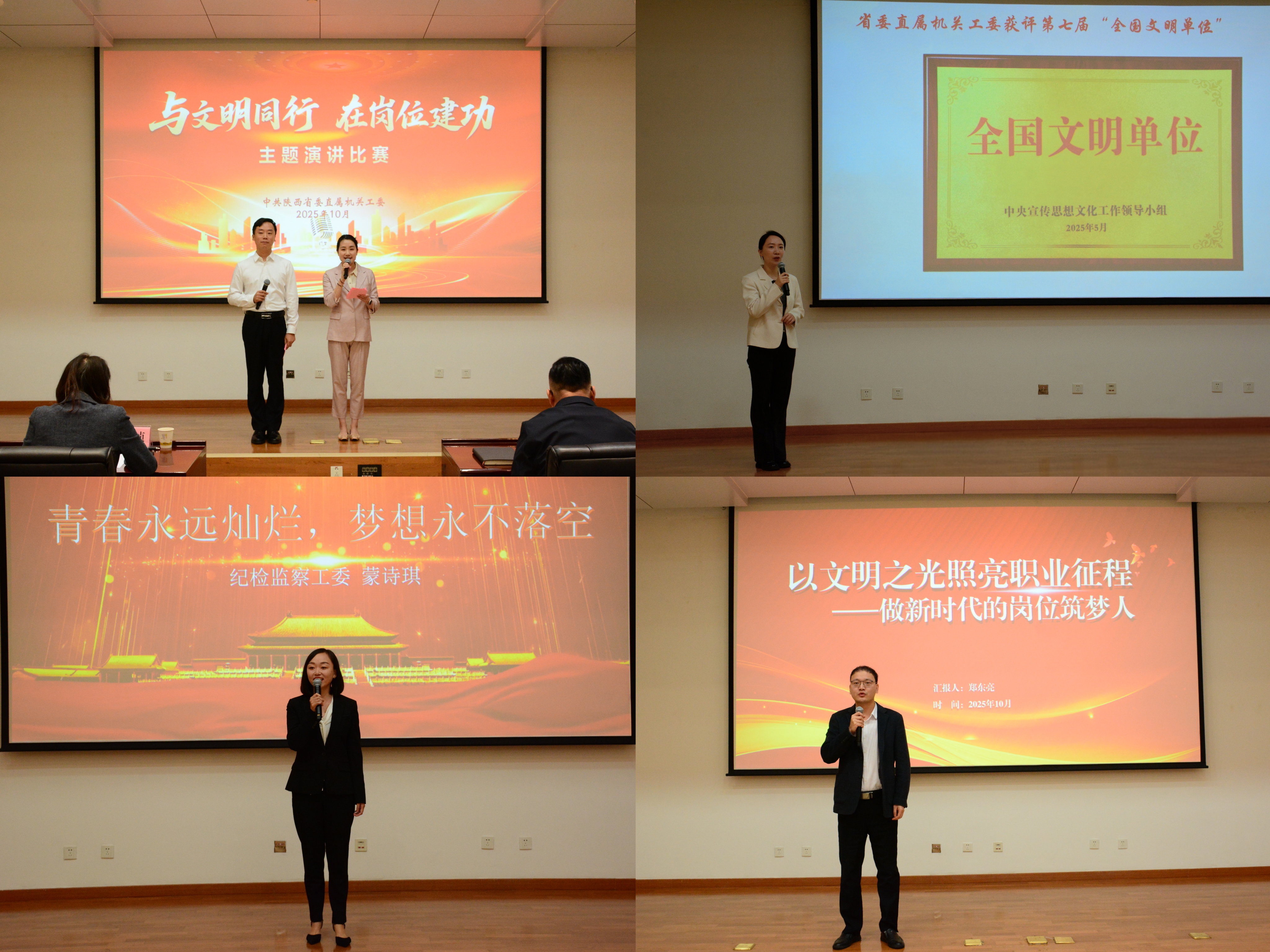 10月22日,省委直属机关工委举办“与文明同行 在岗位建功”主题演讲比赛。这是工委为进一步加强机关精神文明建设,巩固拓展全国文明单位创建成果,引导机关干部将文明理念融入岗位实践的一项重要举措。